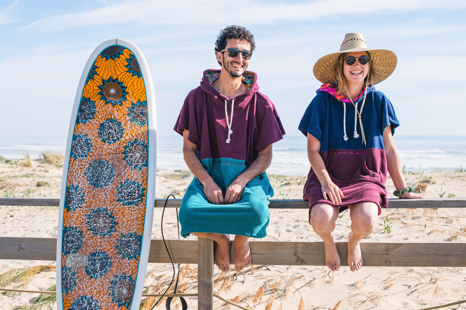 Our exotic surf ponchos mix cotton towel with Mexican ethnic textiles for a unique beach style! Use them to change discreetly, warm up and stay cozy after a surf or a swim. Best of all, each poncho folds into its hood, turning into a stylish bag โ leaving your hands free to hold surfboard, bodyboard, or beloved ones!