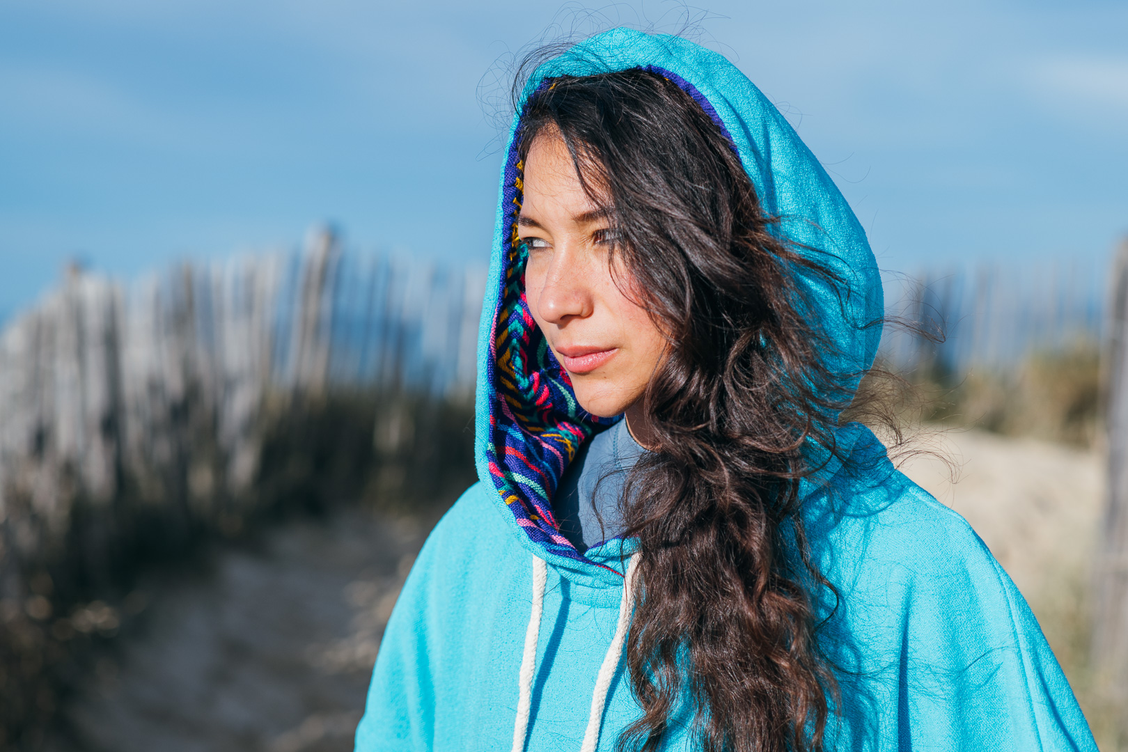 The Caribbean blue surf poncho is made with soft turquoise cotton towel. The design mixes traditional Mexican woven fabric with a purple tribal pattern inside the hoody and pockets giving a unique ethnic style!